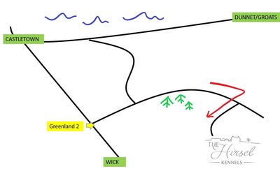 The Hirsel Kennels are located on the road to Greenland. This road branches off the B876 Castletown to Wick road at the sign “Greenland” just outside Castletown.